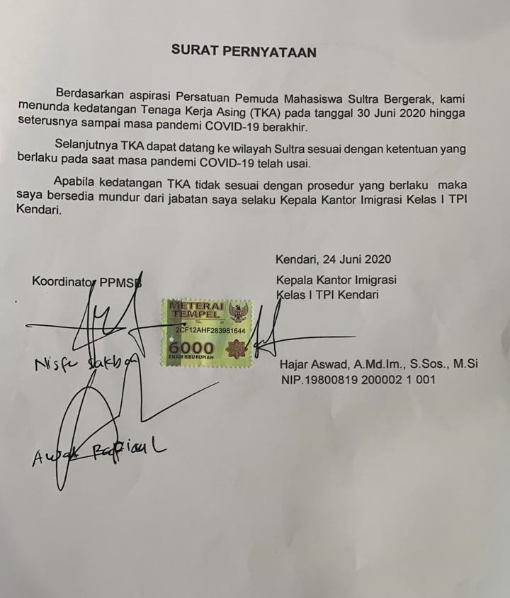 “Kami pegang pernyataannya. Dan ini menurut kami resmi, jadi kalau 30 Juni tetap datang. Maka kami tekankan, Hajar Aswad selaku kepala Imigrasi Kendari silahkan mundur dari jabatannya,” tegasnya.
