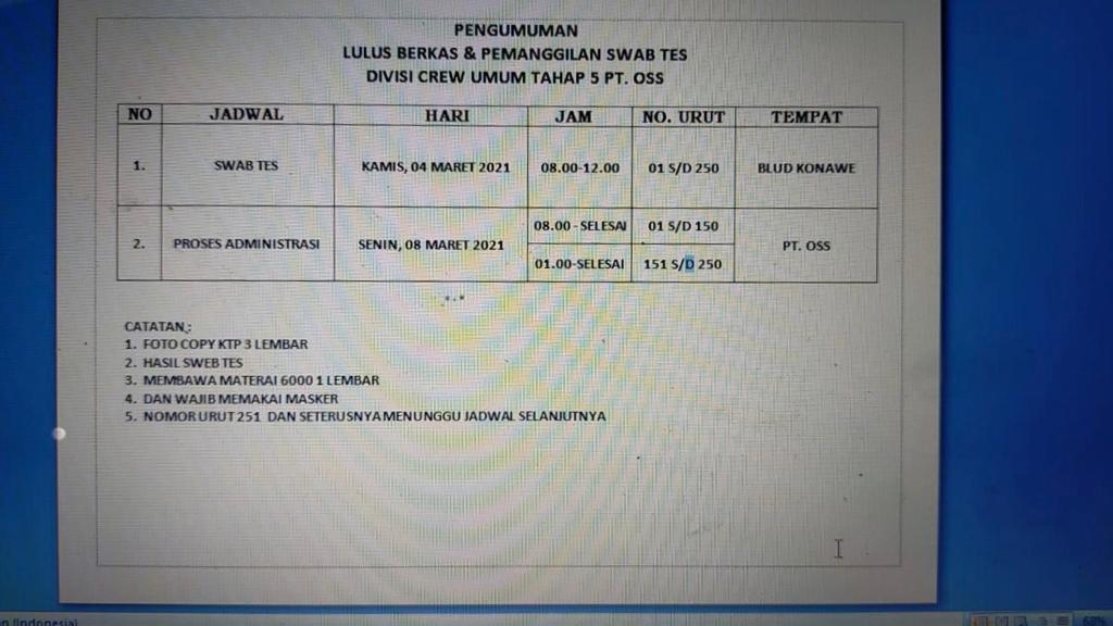 Pengumuman Lulus Berkas dan Pemanggilan Crew Umum PT OSS