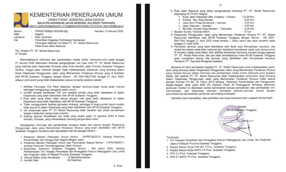 KENDARI – Balai Pelaksana Jalan Nasional (BPJN) Sulawesi Tenggara (Sultra) memberlakukan pembatasan ketat terhadap aktivitas angkutan ore nikel PT ST Nickel Resources di ruas jalan nasional....